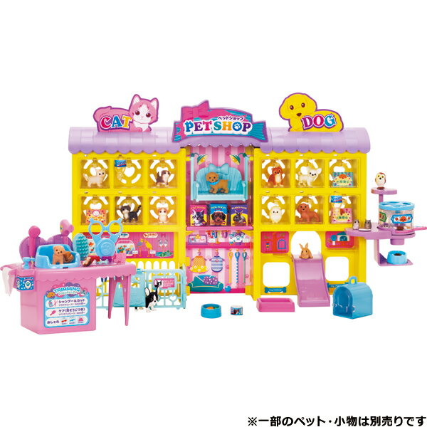 【セット内容】 棚(左・右)(2),ペット(10),屋根(2パーツ)(1),タワー(1),ゲージ(1),ブランコ(1),中央棚(1),キャリーケース(1),エサ皿(2),トイレ(1),お水ボトル(2),缶詰(1),トリマー台(ドライヤー、シャワー付)(1),トリマー台脚(1),トリマー台ボード(1),ハサミ(1),ブラシ(1),エサ(魚、ひまわりの種、肉、ニンジン×各2)(8),おしゃれ小物(リボン、宝石、スカート)(3),すべり台(1),タオル(1),紙ボード(1),看板(2) 【宅配便のみ】